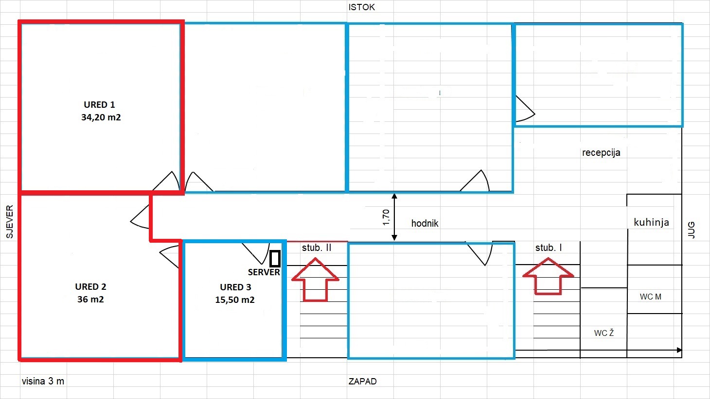 Unfurnished office space for rent on the 1st floor with a total area of 123.75 m2. Consists of 2 larger office rooms and one smaller room. Equipped kitchenette, reception and toilets (M/F) are shared with another tenant on the floor. Office floors: quality laminate in the offices and granite tiles in the hallway. Ceiling: 3-meter suspended ceiling with modern office lighting.